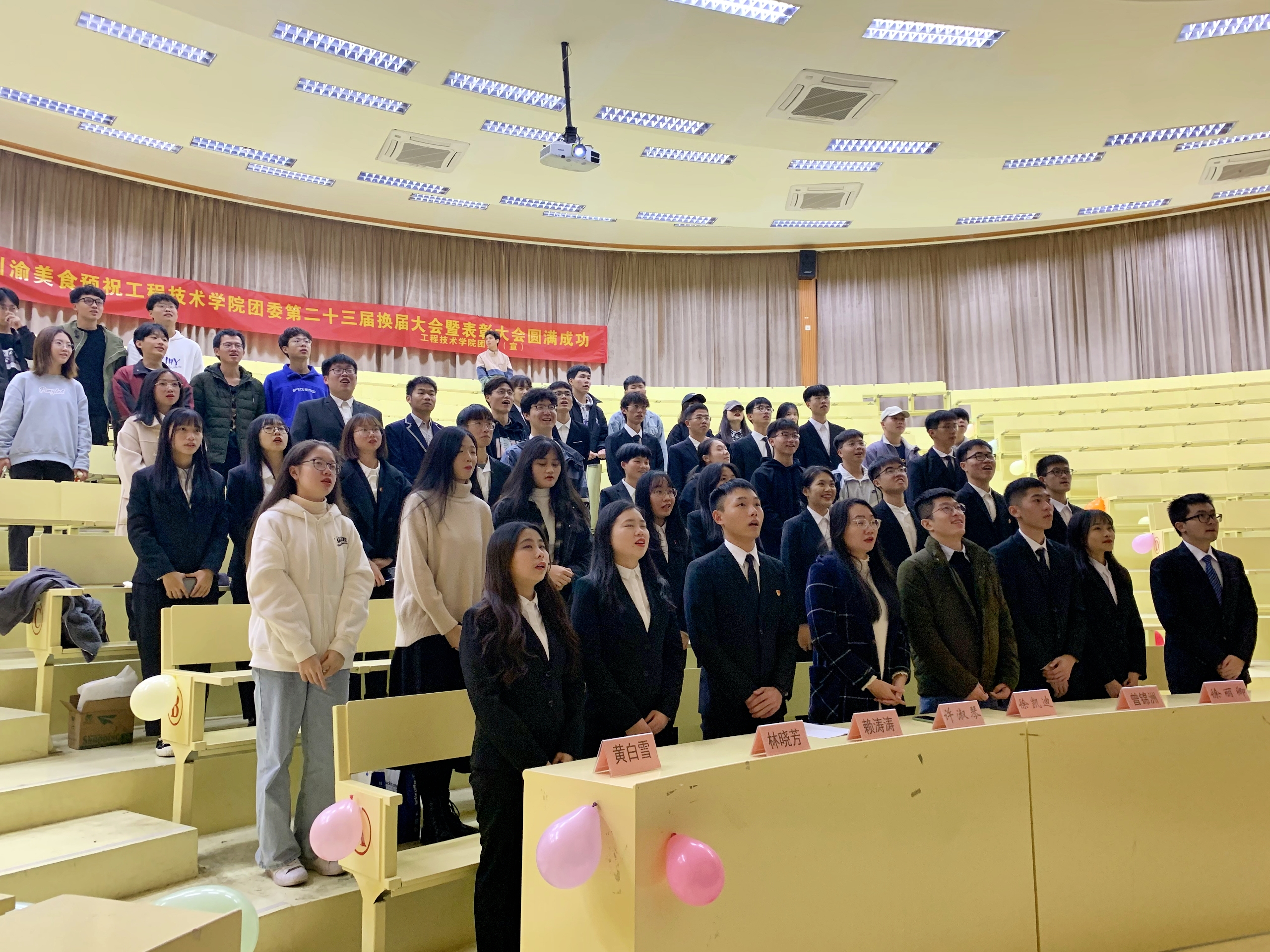 会上为上届各个部门成员颁发聘书,并宣读新一届团委成员名单。随后,全体新任干部进行就职宣誓,表达了努力开创团学工作新局面的决心和信心。