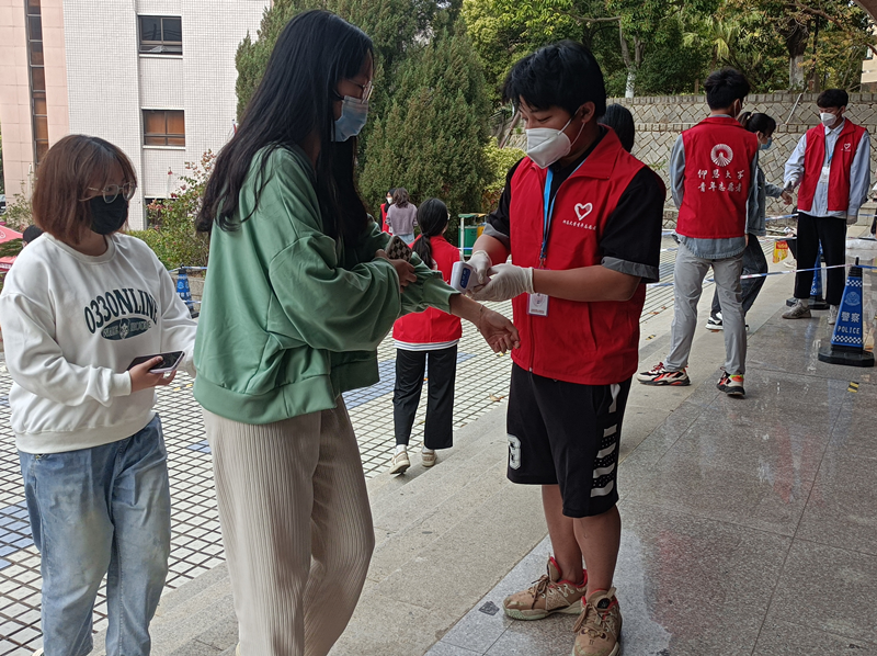 党员志愿者在为同学们测量体温