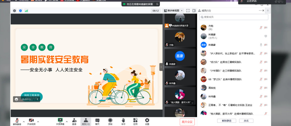 为贯彻落实学校团委对于暑期社会实践工作的要求,加强对暑期社会实践活动的指导,提高安全意识,夯实安全责任,确保2023年社会实践活动安全有序开展。20236月25日下午,网络工程系团总支线上召开了2023年暑期社会实践安全教育大会。所有实践队队长参加会议,会议由网络工程系团总支书记林嘉豪老师主持