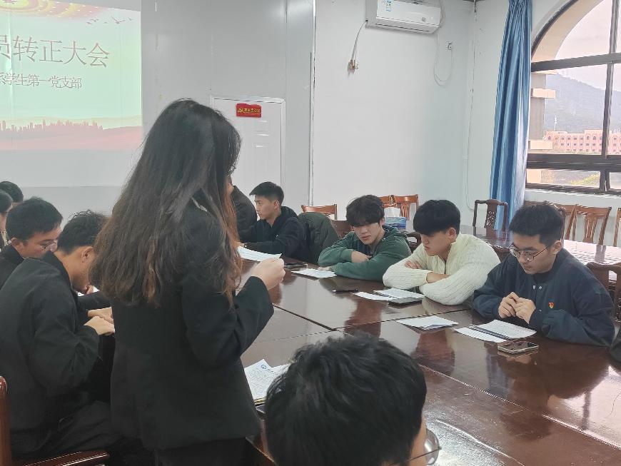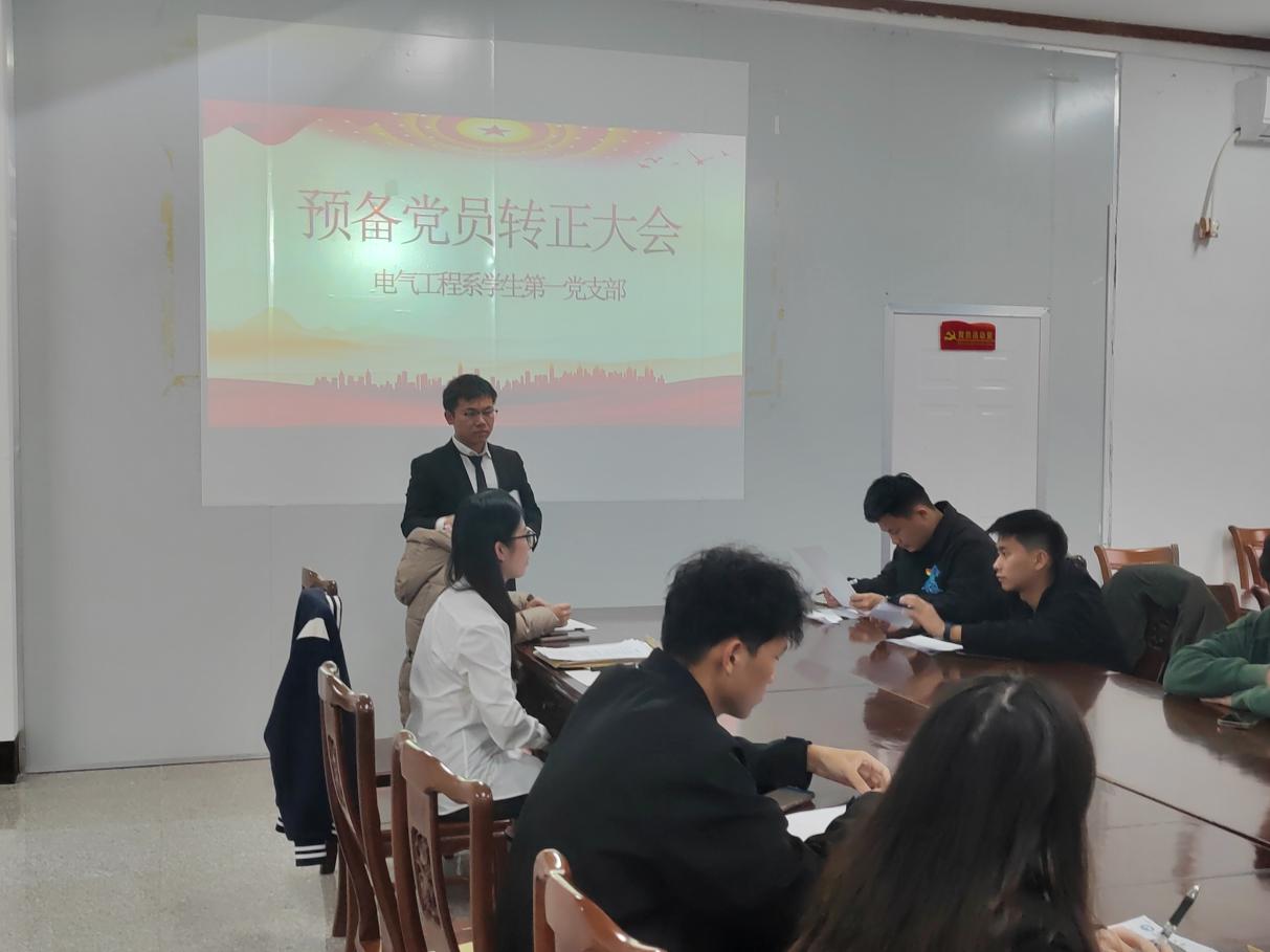 20241212日,电气工程系学生第一党支部在泽钏楼四楼会议室召开了预备党员转正大会,讨论关于郑毅、陈亮5名同志申请转为正式党员的问题。出席本次大会的有支部书记林嘉豪老师以及全体支部党员同志。会议由支部书记林嘉豪老师主持,首先进行转正同志的清点,并宣布到会情况。